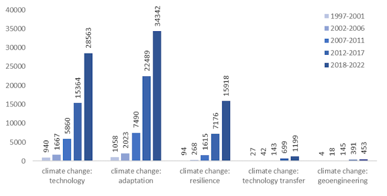 El mundo científico ha venido haciendo los deberes, con casi 300 000 artículos científicos indexados sobre cambio climático tan sólo en el último lustro: un 46 % más que en el quinquenio anterior. Pero es mucho mayor el incremento relativo de los trabajos que tratan sobre la adaptación (53 %), la tecnología (86 %) y su transferencia (72 %) y especialmente la resiliencia (122 %).