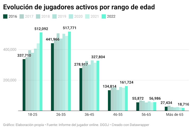 El informe de la Dirección General de Ordenación del Juego (DGOJ, 2015) revela que el inicio antes de los 18 años se da en el 13.4 % de jugadores no problemáticos y en el 44.8 % de los jugadores patológicos. La proporción de jugadores en riesgo es significativamente mayor en los dos tramos de edad más joven, 18-25 y 26-36 años (DGOJ, 2023).