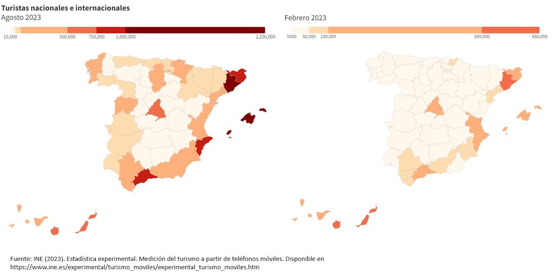 Esta recuperación es innegable si se tiene en cuenta el peso relativo del turismo en el PIB español: 12,8 % para 2023 según proyecciones, sumando los impactos directos (superiores al 6 % del PIB) e indirectos, frente al 12,6% en 2019. Como referencia, ese peso directo es comparable al de toda la construcción (5,7 %) o al del conjunto de las industrias de alimentación (2,3 %), textil (0,7 %), química (1 %), farmacéutica (0,8 %) y maquinaria (0,7 %) (Contabilidad Nacional, INE).