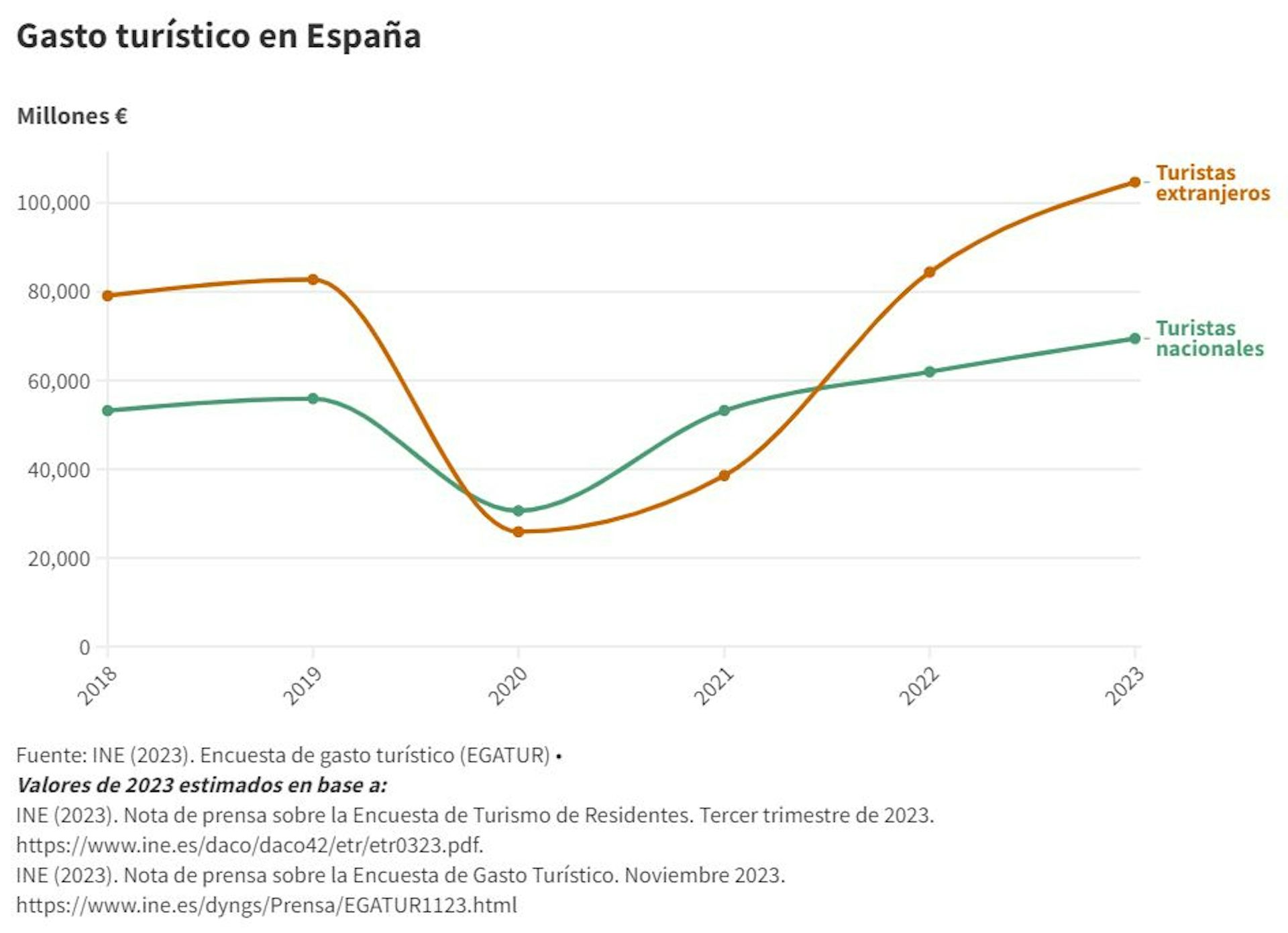 Según los datos publicados por el INE a principios de febrero, en 2023 España recibió más de 85 millones de turistas internacionales, un 18,2 % más que en 2022. Además, el gasto turístico en 2022 superó los valores de 2019 y se prevé que los valores de 2023 sean mayores.