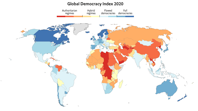 Actualmente, el Democracy Index de The Economist mide a partir de una serie de indicadores (derechos y libertades, intromisión de los poderes públicos, equilibrios de poder, etc.) el grado de democracia de cada país. En el último año, Francia, considerada una democracia clásica –en términos modernos–, ha sido catalogada como una democracia defectuosa (flawed democracy), mientras que España, con apenas cuatro décadas como democracia, se mantiene como una democracia plena (full democracy).